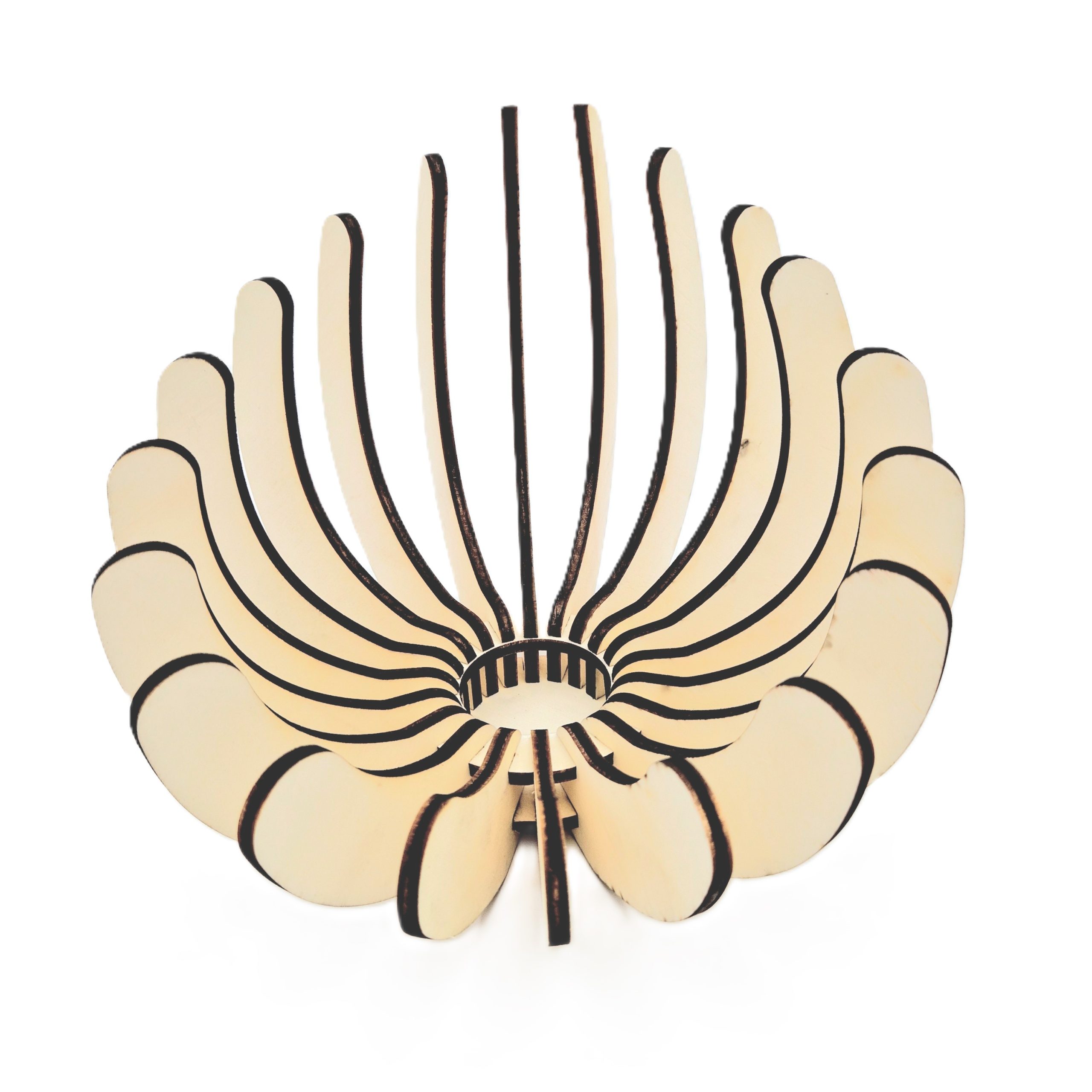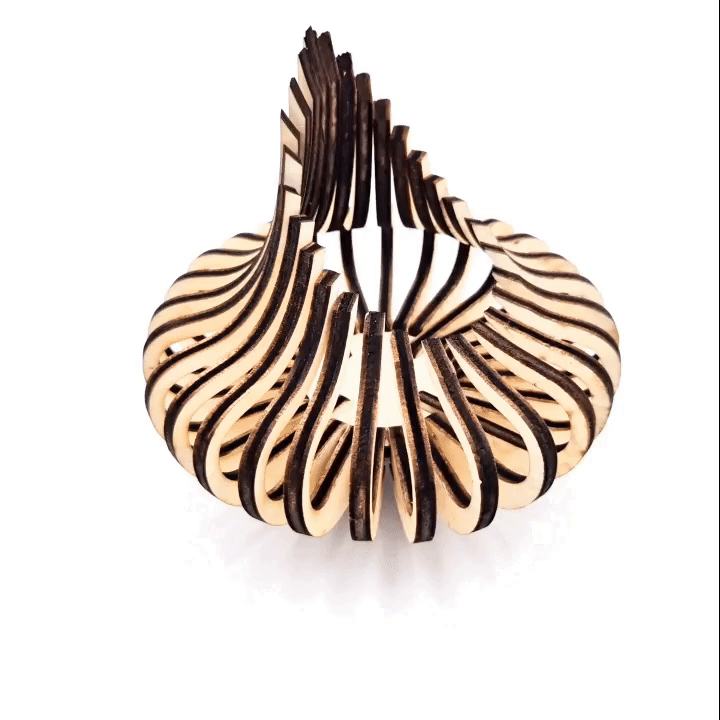 Dekorativna svetilka je izdelana iz topolovega lesa z uporabo natančnega laserskega razreza. Sestavljena je iz 23 kosov bez uporabe lepila, saj ji poseben dizajn in natančnost izdelave omogočata izjemno trdnost in popolno prileganje sestavnih delov. Izdelek je mogoče razstaviti in ponovno poljubno sestaviti. Na sliki je prikazana osnovna oblika svetilke.